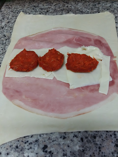colocamos el jamón dulce, el queso y la sobrasada.